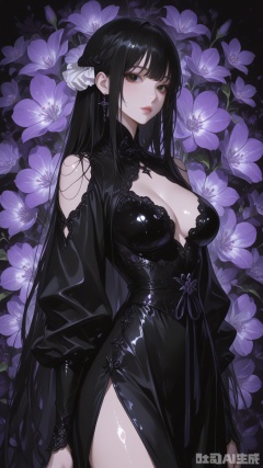 general, sfw, live2d, Glossy and violet flower background,1woman, black hair, solo, breast, exquisite skin, looking at viewer, very awa