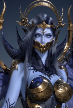 (score_9),<lora:不闻不问-apony-000008:0.85>,bwbw,mouth mask,solo,upper body,<lora:perfect eyes_v1:0.8>,bright pupils,blue eyes,looking at viewer,front view,1girl,solo,hair ornament,headpiece,long hair,black hair,metal halo,(feathered wings),feathered,demon wings,(black claws),dark lips,(finger claws),wrist guards,high collar,detached collar,shoulder armor,breastplate,(bikini_armor:1.1),halo,collarbone,curvy,glamor,pointy breasts,puffy breasts,arm tattoo,simple background,<lora:Expressive_H-000001:0.8>,(colored skin),