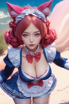 score_9,score_8_up,1girl, solo, breasts, looking at viewer, short hair, large breasts, thighhighs, long sleeves, dress, bow, animal ears, cleavage, pink hair, red hair,