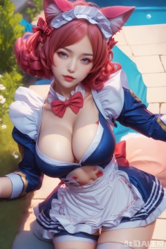 score_9,score_8_up,1girl, solo, breasts, looking at viewer, short hair, large breasts, thighhighs, long sleeves, dress, bow, animal ears, cleavage, pink hair, red hair,