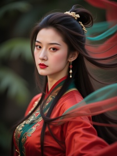 hfxnsas,a young Asian woman with long, flowing black hair, wearing a traditional red and green outfit with a gold headpiece. She has a serious expression and is looking directly at the camera. The background is blurred, but it appears to be an outdoor setting with greenery. The lighting is soft and natural, highlighting her features. The image is high quality, with a shallow depth of field, focusing on her face and upper body.<lora:S-T-汉服仙女-S1.5:1>