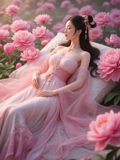hfxnsas,a beautiful woman with long, dark hair styled in an elegant updo, wearing a long, flowing pink and white dress with intricate patterns. She is lying on her back with her eyes closed, surrounded by large, pink peonies. The background is a soft, pastel-colored garden with lush greenery and delicate flowers. The woman has a serene expression, with her hands resting on her stomach. The lighting is soft and ethereal, with a dreamy, romantic atmosphere. The image has a high-quality, realistic style with a touch of fantasy.<lora:S-T-汉服仙女-S1.5:1>