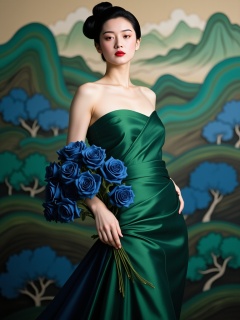 hfxnsas,a woman with pale skin, black hair styled in an updo, and red lipstick, standing in front of a mountainous landscape with green hills and blue trees. She is wearing a strapless, green, off-shoulder dress that is draped elegantly around her body, holding a bouquet of blue roses in her left hand. The lighting is soft and natural, highlighting her features and the texture of her dress. The background is a lush, green landscape with rolling hills and distant mountains. The woman has a serene and elegant expression.<lora:S-T-汉服仙女-S1.5:1>