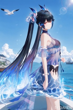 lucia,1girl, solo, long hair, breasts, black hair,red eyes,hair ornament, dress, bare shoulders, twintails, jewelry, very long hair, blue hair, multicolored hair,see through,depth of field, light particles, lens flare, masterpiece,best quality,((artist:reoen),(artist:fuzichoco),(artist:atdan),(artist:torino_aqua:0.5),year 2024:0.5),(artist:omone_hokoma_agm:0.8), 2d, anime,scenery, watercraft, outdoors,  boat, sky, cloud, day, bird, ocean, building, blue sky, water, blue theme,standing,from side,gentle smile,looking at viewer,reach out,perfect hands,