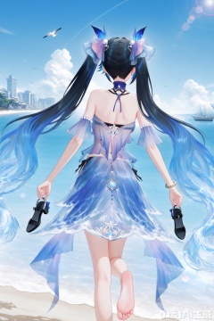 lucia,1girl, solo, long hair, breasts, black hair,red eyes,hair ornament, dress, bare shoulders, twintails, jewelry, very long hair, blue hair, multicolored hair,see through,depth of field, light particles, lens flare, masterpiece,best quality,((artist:reoen),(artist:fuzichoco),(artist:atdan),(artist:torino_aqua:0.5),year 2024:0.5),(artist:omone_hokoma_agm:0.8), 2d, anime,scenery, watercraft, outdoors, boat, sky, cloud, day, bird, ocean, building, blue sky, water, blue theme,standing,from behind,gentle smile,open mouth,looking back,happy,looking at viewer,reach out,perfect hands,holding sandal,spread arms,on one leg,leg up,soles,barefoot,on beach,seaside,detailed water,inviting viewer,good_hands