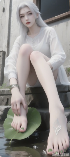 She sat on a huge leaf. Her toes were painted with green nail polish, adding a touch of color to her feet. Her white hair eyes were crimson. She wore a white long-sleeved shirt with green bracelets and a pair of swaying earrings. Her left hand is placed above her left foot and her right hand is placed on her right foot. The background is a white building with a blackboard on the wall, dotted with water droplets, adding a sense of layering to the picture.