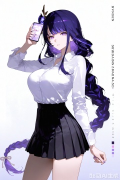 1girl, raiden shogun, breasts, purple hair, solo, skirt, purple eyes, long hair, shirt, braid, phone, large breasts, white shirt, holding phone, black skirt, cellphone, pleated skirt, collared shirt, holding, long sleeves, hair ornament, smartphone, looking at viewer, very long hair, braided ponytail, shirt tucked in, alternate costume, mole under eye, contemporary, jewelry, mole, from side, arm up, cowboy shot, character name, thighs, flower, purple nails
