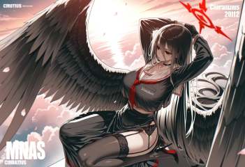 solo,looking_away,Cirrocumulus,Cirrostratus,sky,wind,petals,magazine cover,backlighting,text,masterpiece,best quality,amazing quality,very awa,absurdres,newest,very aesthetic,<lora:莲见-000012:1>,black hair,hair between eyes,long bangs,mole under eye,red eyes,very long hair,diyitao,no ponytail,black choker,black high heels,black garter belt,black gloves,black skirt,black thighhighs,collarbone,garter belt,garter straps,large breasts,long skirt,long sleeves,neckerchief,pleated skirt,red neckerchief,sailor collar,school uniform,serafuku,thighhighs,white sailor collar,halo,black wings,feathered wings,large wings,low wings,****,eyes_closed,stretch,back,sitting,full_body,arm_behind_head,from_side,from_above,
