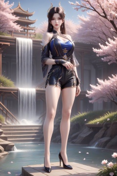 <lora:caoying_v2-000032:0.5>,caoying,1girl,long hair,hair ornament,solo,lips,lipstick,water,earrings,jewelry,falling petals,petals,flower,bare shoulders,brown hair,branch,cherry blossoms,black hair,full body,standing,(legs apart:1.2),looking at viewer,dynamic pose,leaning back,arm support,(outdoors,day,waterfall,sky,cloud,park,park bench,lamppost,),masterpiece,highres,absurdres,best quality,8K,high-res detailed,alternate costume,white costume,china dress,chinese clothes,puffy_shorts,looking at viewer,dynamic pose,outdoors,wall,sky,blue sky,cloud,<lora:sh-glossy_r2:0.5>,black_pantyhose,high heels,louboutin heels,black heels,red bottom heels,footwear,<lora:Louboutin_Heels__PONY:0.5>,<lora:LegLength&Muscular_400steps:1.5>,<lora:DetailedEyes_V3:0.5>,
