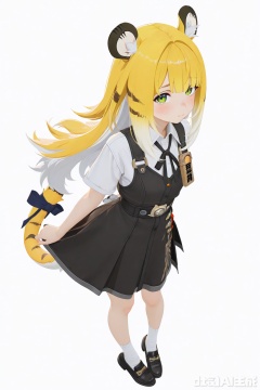 masterpiece,best quality,amazing quality,newest,absurdres,highres,very awa,jufufu,jufufu\(zenless zone zero\),solo,1girl,full_body,blonde_hair,white_hair,long hair,tiger_tail,tail_ribbon,green_eyes, white shirt, black dress, official_art,blush,white_background,simple_background,monochromatic_background,looking at viewer,white socks, tiger_ears,black loafers, work_badge,loli,