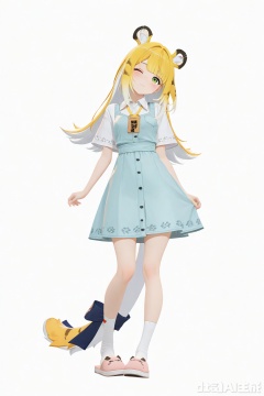 masterpiece,best quality,amazing quality,newest,absurdres,highres,very awa,jufufu,jufufu\(zenless zone zero\),solo,1girl,full_body,blonde_hair,white_hair,long hair,tiger_tail,tail_ribbon,green_eyes, light blue sundress, official_art,blush,white_background,simple_background,monochromatic_background,looking at viewer,white socks, light pink slippers,tiger_ears,work_badge,one_eye_closed,happy,