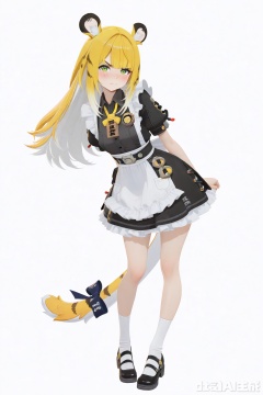 masterpiece,best quality,amazing quality,newest,absurdres,highres,very awa,jufufu,jufufu\(zenless zone zero\),solo,1girl,full_body,blonde_hair,white_hair,long hair,tiger_tail,tail_ribbon,green_eyes,long maid_dress, official_art,blush,white_background,simple_background,monochromatic_background,looking at viewer,white socks, black mary_janes,tiger_ears,work_badge,standing_on_one_leg,angry,