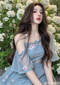 Realistic portrait photography, high-definition close-up. A long-haired girl was in front of the fresh jasmine flowers blooming. She was wearing a light blue floral chiffon dress, lowered her head slightly, with a shy and gentle smile on the corner of her mouth, and was reaching out to touch a white flower close to her. The soft side backlight in the early morning outlines the outline of her hair and face, and the light passes through the petals, creating a subtle projection and halo on her cheeks. The skin is delicate and real, and the eyes are pure. The air is filled with the fragrance of flowers and morning dew, and the picture is full of the purity and freshness of summer mornings. The shallow depth of field is excellent.