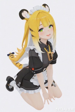 masterpiece,best quality,amazing quality,newest,absurdres,highres,very awa,jufufu,jufufu\(zenless zone zero\),solo,1girl,full_body,blonde_hair,white_hair,long hair,tiger_tail,tail_ribbon,green_eyes,maid_dress, official_art,blush,white_background,simple_background,monochromatic_background,looking at viewer,white socks, black mary_janes,tiger_ears,work_badge,kneeling,:d,work badge,loli,thigh strap,