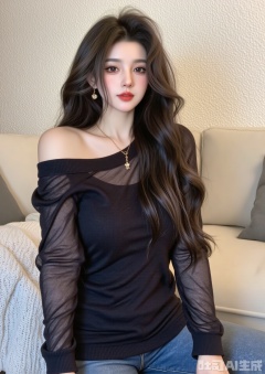 The image shows a person with long, wavy, dark brown hair, styled to one side. They are wearing a dark, off-the-shoulder top made of a mesh-like material. A delicate gold necklace with a small pendant is visible around their neck. The person is seated, and the background consists of a textured, light-colored wall and a light-colored couch. The overall setting appears to be indoors, likely in a living room or similar space.