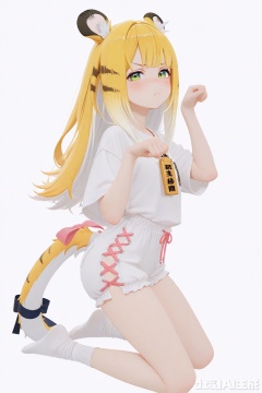 masterpiece,best quality,amazing quality,newest,absurdres,highres,very awa,jufufu,jufufu\(zenless zone zero\),solo,1girl,full_body,blonde_hair,white_hair,long hair,tiger_tail,tail_ribbon,green_eyes,white and pink pajama shirt, white and yellow pajama pants, official_art,blush,white_background,simple_background,monochromatic_background,looking at viewer,white socks, no shoes,tiger_ears,work_badge,kneeling,:d,loli,cute,tsunderia,pout,paw_pose,