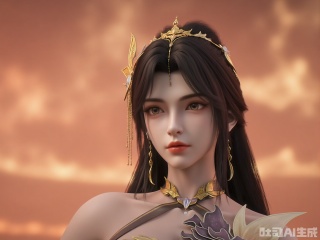 A stunning, digital fantasy art portrait of a young woman with porcelain skin and long, straight black hair. She wears a golden, ornate crown with intricate designs and matching earrings. Her eyes are large and expressive, with a hint of melancholy. She has full, red lips and a delicate, symmetrical face. The background is a blurred, warm gradient, suggesting a sunset or sunrise. The style is realistic with a touch of fantasy, emphasizing elegance and ethereal beauty. The lighting is soft and warm, highlighting her features and creating a serene, almost otherworldly atmosphere.