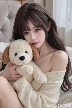 In the image, she is holding a small, plush toy dog in her right hand, which she is gently cradling close to her chest. The toy dog is made of a fuzzy, off-white material with brown patches on its head and body, resembling a puppy. The background of the image is softly blurred, indicating it is taken indoors, possibly in a bedroom. The headboard of a bed is visible behind her, upholstered in a neutral, light gray fabric. The overall lighting is natural, likely from a window, casting a soft, even light over the scene. The image has a warm, intimate atmosphere, with the subject's serene expression and the cozy, comforting presence of the toy dog contributing to a sense of calm and tenderness.