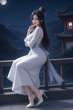 <lora:luxueqi_v1-000012:0.5>,luxueqi,1girl,solo,hair ornament,hair bun,facial mark,single hair bun,shiny,closed mouth,long hair,lips,lipstick,red lips,night sky,[moon],star \(sky\),chinese style architecture,lantern,white dress,earrings,black hair,jewelry,dress,hair ornament,sash,moon,railing,clothing cutout,long sleeves,masterpiece,highres,absurdres,best quality,8K,high-res detailed,looking at viewer,light smile,standing,(hands folded over the lower abdomen:1.2),full body,<lora:sh-glossy_r2:0.7>,white_pantyhose,high heels,louboutin heels,(white heels:1.2),footwear,<lora:Louboutin_Heels__PONY:0.5>,