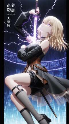 cover,geometric background,Dojinshi,Graphic Design,illustration cover,color art,intricate details,high contrast,detailed background,beautiful detailed,1girl,solo,facing up,electricity,floating hair,holding sword,human scabbard,neon lights,glowing katana,holographic circuits,vibrant colors,cinematic lighting,high-tech accessories,futuristic vibes,ready to draw,scabbard,dynamic pose,thunder sword,masterpiece,best quality,amazing quality,<lora:三角初华:1>,Misumi Uika,blonde hair,hair between eyes,medium hair,purple eyes,diyitao,diyi bare shoulders,diyi black skirt layered,diyi black high heels,diyi black knee-length shorts,diyi brown corset,diyi detached sleeves,diyi earrings,diyi grey knee-high socks,diyi black choker,diyi black legwear garter at knees,