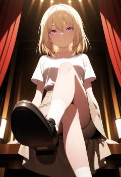 masterpiece,best quality,ultra-detailed,very aesthetic,sharp focus,vibrant colors,ray tracing,best lighting,detailed illustration,detailed background,cinematic,general,sensitive,explicit,neon,light,vibrant colors,glow,score_9,score_8_up,score_7_up,source_anime,looking_down,from_below,sit on the edge of the stage,stage,concert,sound,voicevox,red curtain,soft shadows,soft natural lighting,dramatic lighting,(rich tones:0.9),low angle,(gradient:1.1),looking_at_viewer,smile,(darkness:1.5),(foot focus:1.1),front view,crossed_legs,<lora:三角初华:1>,Misumi Uika,blonde hair,hair between eyes,medium hair,purple eyes,diertao,dier black footwear,dier collarbone,dier beige long skirt,dier white shirt,dier shirt tucked in,dier short sleeves,dier white socks,