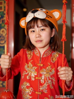 8K ultra-realistic, Polaroid 600 film 1.3. The little girl is in close up, wearing a tiger-head hat, a red Tang cotton jacket, and a golden auspicious cloud embroidered on her collar and cuffs. Holding the red lantern with both hands, the corners of his mouth raised, and his eyes were bright. The background is the courtyard door covered with Spring Festival couplets. The sun shines on the body, and the warm yellow light is 1.5. Polaroid film has a warm yellow color cast, a color temperature of 3800K, and a slight scratch on the photo paper tape. Using Nikon Z9 with a 50mm f1.8 lens, aperture f3.2, shutter 1 160s, highlighting New Year's festiveness and childlike innocence