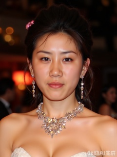 The image shows a young woman with dark hair styled in an elegant updo, adorned with a delicate necklace featuring floral designs. She is wearing matching earrings and a strapless top, suggesting a formal or evening event setting. The background is blurred, with warm, glowing lights creating a festive atmosphere, possibly indicating a party or celebration. The overall composition and lighting suggest a glamorous and sophisticated environment.