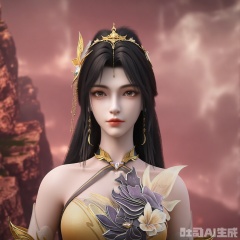 This image depicts a very fine character wearing a carefully crafted golden robe with intricate patterns and designs. The robe has floral patterns on its chest, and the flowing fabric extends into long, translucent sleeves. The character has long black hair and wears gold accessories including headdresses and earrings. The background is a striking red-brown sky with clouds floating and a huge rocky structure can be seen in the distance. The entire scene has a fantasy or mythological theme. The picture quality is very high, the resolution is very high, the characters are exquisite, and the scenes are empty
