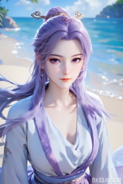 1girl, solo, score_9,score_8_up,long hair, hair ornament, long sleeves, dress, purple eyes,ponytail, purple hair, hair bun, white dress,  sash,The Purple Dress,upper body,looking at viewer,on the beach,on the beach,