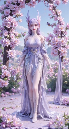 The best quality, ultra-high resolution, masterpiece, original, extremely fine wallpaper, perfect light effect, this is a digital illustration, vertical full-body portrait, densely packed with white flowers, creating a rich and textured background. In the center of the picture, a beautiful Chinese woman is in the white flowers, making her look like she is part of a garden full of flowers. The flowers around her add depth and sense of encirclement to the picture and enhance the layering of the composition. Her stunning white evening gown echoes the purity and elegance of the surrounding flowers. The woman was facing the camera, among the lush flowers, her eyes were charming and quiet. The dense floral background and capture of the woman's whole body highlight the exquisite fusion of human elegance and nature. The long white hair is straight, the picture has blur and halo effects, and butterflies embellish it. She has an angel's beautiful face and a perfect female figure (a skirt composed of flowers, intensity coefficient, translucent body, transparent petals, glowing petals, gradient effect, contour light, particles, award-winning artwork. She has fair skin tone, fine black details and soft and flowing hair carefully combed to complex hair accessories, with gorgeous details. She is in a bright garden with gorgeous flowers, a blue sky, and deep and rich tones.), her head is decorated with exquisite and complex hair accessories, and some tulle fabrics naturally hang down, creating a dreamy feeling, exquisite and unique. The overall look shows the beauty and tenderness of a girl, just like a fairy in a fairy tale, exuding charm. This charming character is portrayed in a surreal style. She has elegant movements, and the overall style of this illustration is extremely delicate, focusing on the combination of realistic and fantasy elements.,XlinziyueYH,Xbigbreasts