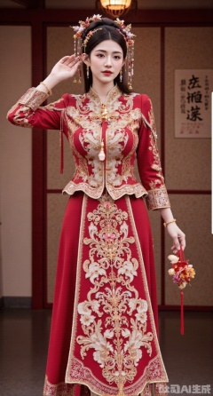 (masterpiece, best quality:1.2),masterpiece, best quality, A Chinese - style wedding - dress girl wearing a bright - red Xiuhe dress stands in an antique Chinese courtyard. The Xiuhe dress adopts the traditional Suzhou embroidery technique. The collar, cuffs, and hem are embroidered with auspicious phoenix - peony patterns, interwoven with gold and silver threads, dazzling. The upper garment has a stand - collar design, with delicate and small buttons. The lower mami skirt has neat pleats, and the skirt body is embroidered with delicate ruyi cloud patterns. The girl wears a phoenix coronet, inlaid with pearls and gemstones, and the hanging bead strings sway gently. She has red - gemstone earrings, a necklace inlaid with rubies around her neck, and a pair of jade bracelets on her hands. In the courtyard, red candles are brightly lit, and happy characters are pasted, creating a strong festive atmosphere for a Chinese - style wedding, (huge breasts, full breasts),(huge breasts, full breasts:2.99),XyunxiaoYK,Xbigbreasts,Xrixirenxiangsheying,Xmengru,XfuqingyunY,XluxueqiXY2,Xtangzichen,Xxiuhefu