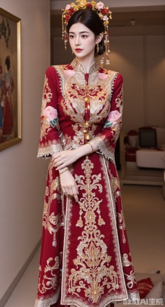 (masterpiece, best quality:1.2), A Chinese - style wedding - dress girl wearing a wine - red Xiuhe dress waits for the auspicious time in the flower hall of a Chinese - style courtyard. The Xiuhe dress uses Kaifeng embroidery techniques. With wine - red brocade as the fabric, it is embroidered with delicate mandarin ducks and twin lotus flowers. The stitches are fine, and the colors are bright. The stand - collar design is paired with golden buttons, and the shoulders and hem of the upper garment are embroidered with ruyi patterns outlined by golden silk threads. The lower mami skirt is embroidered with wine - red peonies, and a golden yingluo hangs at the skirt gate. The girl wears a red - gemstone hair crown, inlaid with pearls, wine - red gemstone earrings, a necklace with alternating red agate and golden beads around her neck, and a red jade bracelet on her hand. The flower hall is elegantly furnished, with exquisite porcelain and flowers, full of festivity and warmth, ,(huge breasts, full breasts:2.99),XyunxiaoYK,Xbigbreasts,Xrixirenxiangsheying,Xmengru,XfuqingyunY,XluxueqiXY2,Xtangzichen,Xxiuhefu