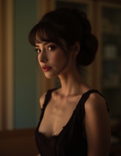 portrait of a woman,retro style,elegant dress,soft lighting,high resolution,professional grade,RAW photography,evocative composition,Cinematic Lighting,moody lighting,perfect eyes,depth of field,virtual background,eyes focus,