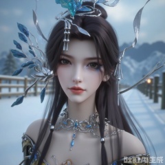 The background is a scene covered with snow, you can see wooden fences, dead trees, and continuous mountains in the distance. The gloomy sky and snow scenes jointly create a quiet and cold environment, highlighting the character's expression and temperament