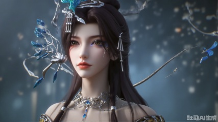 Realistic digital artwork of a young woman with long black hair, gorgeous silver jewelry and intricate foliage-like decorations. Her skin is smooth, with a soft, radiant complexion and an almost otherworldly look