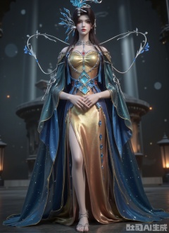 She stood solemnly, wearing gorgeous golden and blue fantasy costumes, as well as ancient Chinese sandals, with complex designs and artistic style reminiscent of fantasy anime, with a dreamy and otherworldly beauty.