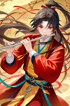1boy, solo, male focus, holding, looking at viewer, holding weapon, holding instrument, red eyes, long hair, black hair, hair ribbon, ponytail, chinese clothes, long sleeves, ribbon, red ribbon, weapon, instrument, sword, playing instrument, flute, hanfu