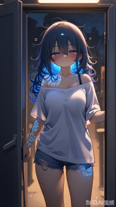best quality,highres,masterpiece,sparkles,ornate,bloom light,ambilight,halatio,detail skin,((skin glowing, subsurface scattering)),particles,ray tracing,gritty, nighttime, urban trailer park, woman standing in front of an old rusty trailer with door open, wearing torn cut-off jean shorts and a dirty cut-off off-the-shoulder old t-shirt with long messy tangled dark curly hair and many tattoos , cute face, sweaty, drunk