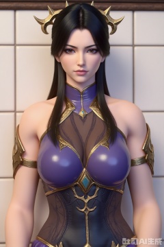 1girl, solo, long hair,big breasts, looking at viewer, black hair, hair ornament, purple dress, bare shoulders, brown eyes, closed mouth, cowboy shot,,SuMei,purple nail polish,white tile wall background
