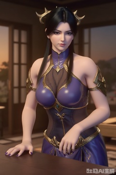 1girl, solo, long hair,huge breasts,cleavage, looking at viewer, black hair, hair ornament, purple dress, bare shoulders, brown eyes,Supporting the table with hands,learning forward, SuMei,purple nail polish,living room,modern styl,