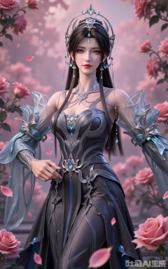 qingyi,At the heart of the frame, a stunning beauty with jet-black hair dances gracefully. Her lustrous locks cascade like a waterfall, shimmering with a pearlescent glow, while delicate silver hair ornaments accentuate her regal elegance. Her gray eyes gleam with a faint pink hue, and her lips, adorned with crimson gloss, glisten softly. She wears an opulent traditional-style gown, its exquisite tailoring highlighting her voluptuous curves. The skirt, embellished with black striped patterns and gemstone accents, sways with her movements, and the sleeves—crafted from sheer gauze and satin—sparkle with blue crystal embellishments at the cuffs.