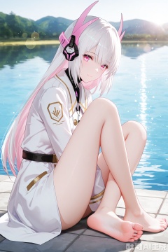 1girl,liv-eclipse/(punishing gray raven), solo, long hair, bangs,  white hair, pink eyes, headgear,white coat, pink inner hair,soft gentle eyes,light smile,depth of field, light particles, lens flare, masterpiece,best quality,((artist:reoen),(artist:fuzichoco),(artist:atdan),(artist:torino_aqua:0.5),year 2024:0.5),(artist:omone_hokoma_agm:0.8), 2d, anime,full body,sitting by lake,barefoot,