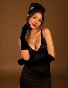 This is a photograph of an Asian woman posing in a sultry,elegant manner. She is standing against a soft,warm background that is likely a gradient of brown and beige tones. Her skin is fair and smooth,with a slight golden hue. Her dark brown hair is styled in an intricate updo,adorned with a sparkling hair accessory that adds a touch of glamour.,She is wearing a form-fitting,black dress with a deep V-neckline that exposes her shoulders and upper back. The dress is made of a luxurious,satin-like fabric that drapes elegantly over her slender frame. She is accessorized with long,black velvet gloves that extend past her elbows,adding a touch of vintage sophistication.,Her makeup is striking,with bold red lipstick and subtle eyeshadow that enhances her large,expressive eyes. She is gazing directly into the camera with a seductive expression,her lips slightly parted and her right gloved hand gently touching her cheek.,In the foreground,there is a soft,warm light source that casts a gentle glow,highlighting her features and creating a warm,intimate atmosphere. The overall mood of the photograph is elegant and sensual,with a vintage-inspired aesthetic.,