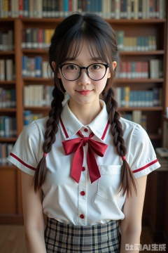 Realistic photo of a young woman with double braids, fashion glasses, fair skin, school uniform, plaid skirt, upper body, library,