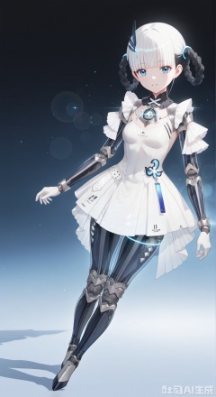 bangbi,1girl, solo, looking at viewer, blue eyes,blunt bangs, black hair, gloves, dress, full body, braid, white hair, multicolored hair, gradient, gradient background, science fiction, android, joints, robot joints,soft gentle eyes,gentle expression,parted lips,light smile,depth of field, light particles, lens flare, masterpiece,best quality,((artist:reoen),(artist:fuzichoco),(artist:atdan),(artist:torino_aqua:0.5),year 2024:0.5),(artist:omone_hokoma_agm:0.8), 2d, anime,full body,floating,from above,