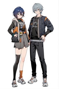 8k,best quality,masterpiece,(ultra-detailed),(high detailed skin),(year 2024:0.8),flat color,artist:maidforge,artist:aqua inc.,artist:edoya inuhachi,artist:reoen,artist:fuzichoco,full body,full shot,standing,looking at viewer,(solo:1.2),simple background,(white background:1.2),hand on own hip,(white background:1.1),Wise and Belle,1boy and 1girl,(hand in hand:0.9),symmetrical composition,<lora:zhelinew-ill-Tanger:0.8>,Belle \(Zenless Zone Zero\),clothes: Belledef black-and-yellow jacket,dark blue hair,1girl,Belledef grey skirt,blue hair,shirt,single black thighhigh,hair ornament,belt,bangs,hair between eyes,sneakers,single thighhigh,Wise \(Zenless Zone Zero\),grey hair,clothes: Wisedef black jacket,1boy,male focus,white sneakers,Wisedef black pants,black shirt,long sleeves,