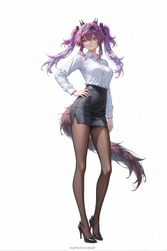 8k,best quality,masterpiece,(ultra-detailed),(high detailed skin),((artist:reoen),(artist:fuzichoco),(artist:atdan),(artist:torino_aqua),year 2024:0.8)1girl,[artist:wlop],[artist:ningen_mame],artist:ciloranko,[[artist:rhasta]],artist:tidsean,colorful,full body,full shot,standing,(solo:1.2),simple background,(white background:1.2),hand on own hip,(white background:1.1),<lora:lupawave-ill-Tanger:0.8>,lupa \(Wuthering Waves\),lupa hair ornament,waist black mark,1girl,twintails,breasts,purple hair,yellow eyes, tail ,1girl,long hair,hair between eyes,jewelry,hair ornament,skirt,office lady,shirt,pencil skirt,pantyhose,white shirt,high heels,black skirt,breasts,black footwear,long sleeves,alternate costume,high-waist skirt,brown pantyhose,contemporary,shirt tucked in,thighs,black pantyhose,miniskirt,medium breasts,collared shirt,