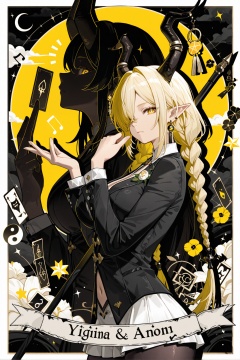 chihaya_anon,1girl,::,__artist__,year 2024,(drop shadow:1.4),(close-up:0.8),(shadow:1.2),(hands up:1.2),(border:1.2),(outside border:1.2),(hand up:1.2),(character name:1.2),from side,hand up,closed mouth,upper body,high contrast,frown,looking at another,looking at viewer,rope,portrait,drop shadow,sparkle,^ ^,flag,limited palette,moon,yin yang,bug,notice lines,cloud,traffic cone,star (symbol),circle,silk,traffic light,arrow (symbol),staff,(musical note),(((tarot card))),black theme,(((sun))),cube,crescent moon,flower,sunlight,colorful,very awa,masterpiece,best quality,newest,highres,absurdres, <lora:yixuan-moxin-ill-Tanger:0.8>,clothes: moxing black suit,white ruffled underdress peeks,attached auxiliary sleeves,black pantyhose,moxing black suit jacket,<lora:wzhang-devil-noob-Tanger-000014:0.8>,Owari,1girl,breasts,pointy ears,horns,braid,hair over one eye,navel,long hair,hetero,jewelry,earrings,yellow eyes,twin braids,large breasts,blonde hair,