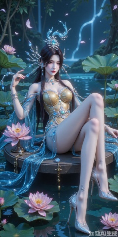 A gentle breeze carries the fragrance of lotus blossoms as Xiao Bai reclines upon a floating raft of lily pads, her blue gown cascading like liquid starlight. black tresses flutter in the wind, the twelve-jade hairpin's pendants waltzing with falling cherry petals. Sheer stockings trace the elegant lines of her legs, while pearl-encrusted shoes skim the emerald waters, conjuring gilded ripples.