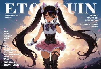 solo,(front view:1.3),looking_away,Cirrocumulus,Cirrostratus,sky,wind,petals,magazine cover,backlighting,text,masterpiece,best quality,amazing quality,very awa,absurdres,newest,very aesthetic,anime coloring,<lora:蕾拉:1>,leila,black hair,very long hair,purple eyes,twintails,black belt boots,belt,one black thighhighs,bowtie,corset,cross-laced footwear,white gloves,fingerless gloves,hair ornament,hair ribbon,jewelry,pink skirt,ribbon,sleeveless skirt,thigh strap,eyepatch,